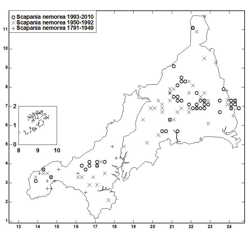 on flat ground in areas of old copper-mine spoil (with Scapania compacta, Solenostoma